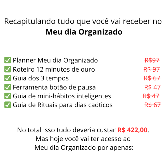 No total isso tudo deveria custar R$ 422,00. Mas hoje você vai ter acesso ao Meu dia Organizado por apenas: